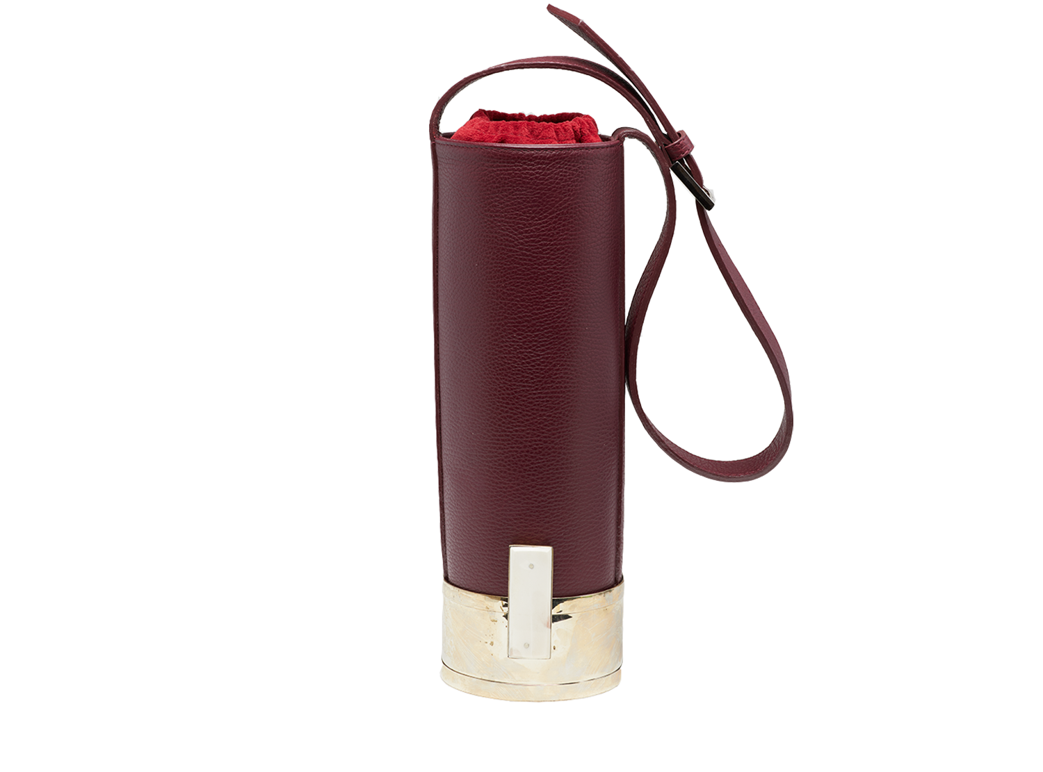 There is a bordeaux bag handsaw to the leather tube. It ties with a leather string of leather with small horn elements.