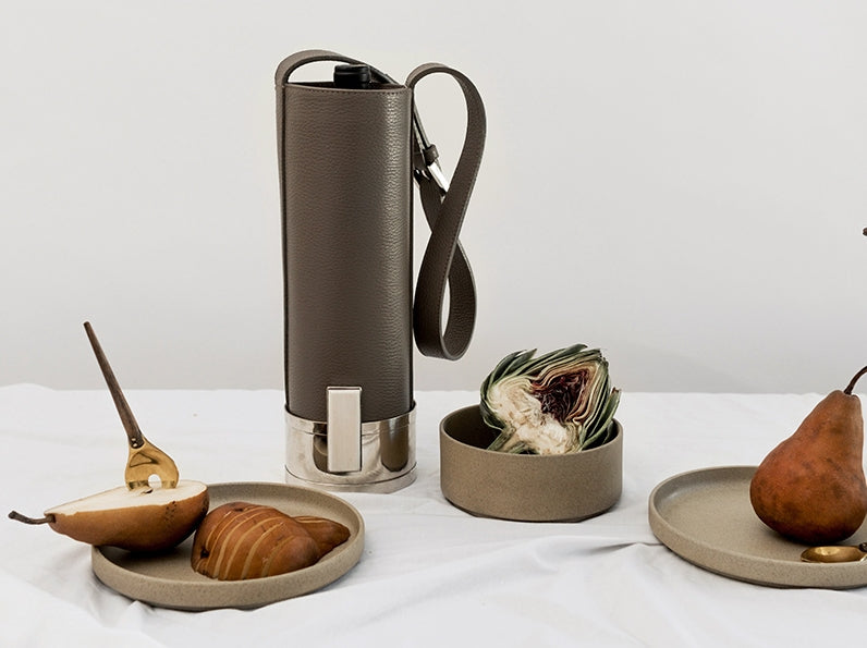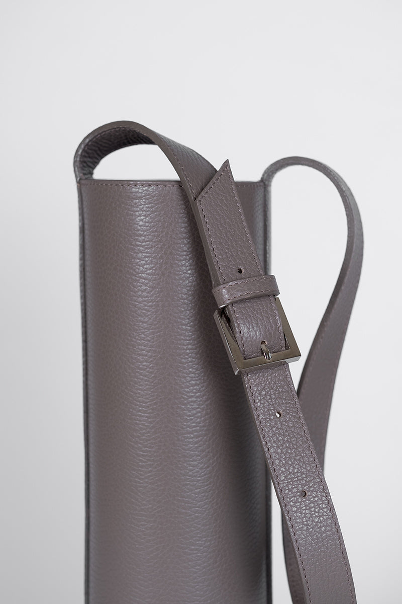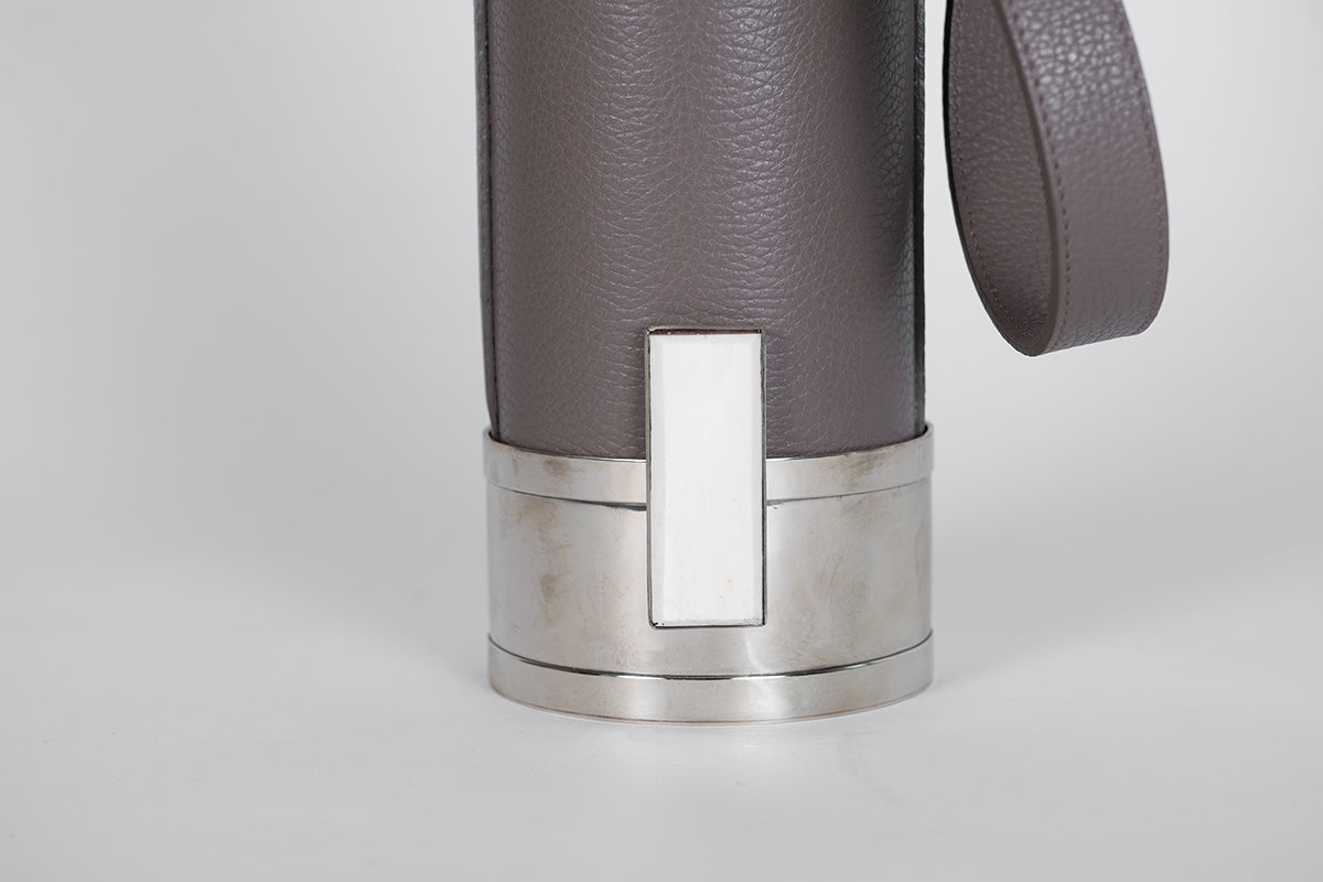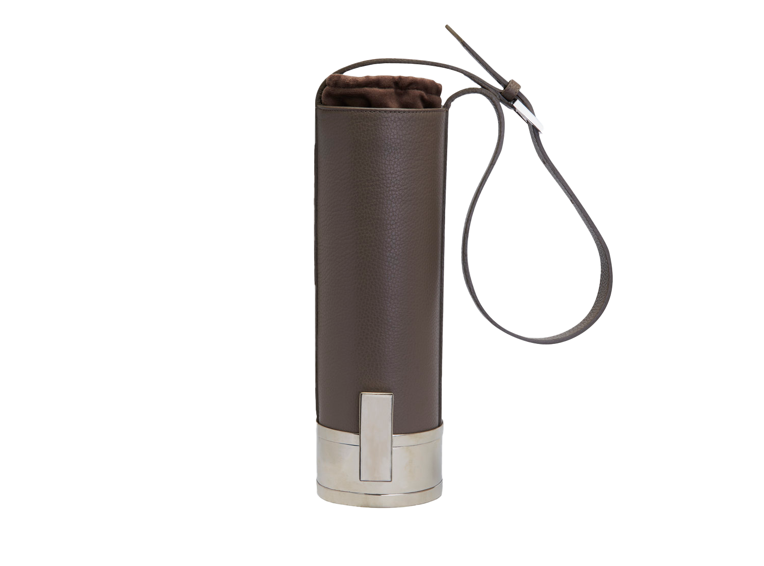 There is a contrasting dark chocolate velvet bag handsaw to the leather tube. It ties with a leather string of leather with small horn elements.