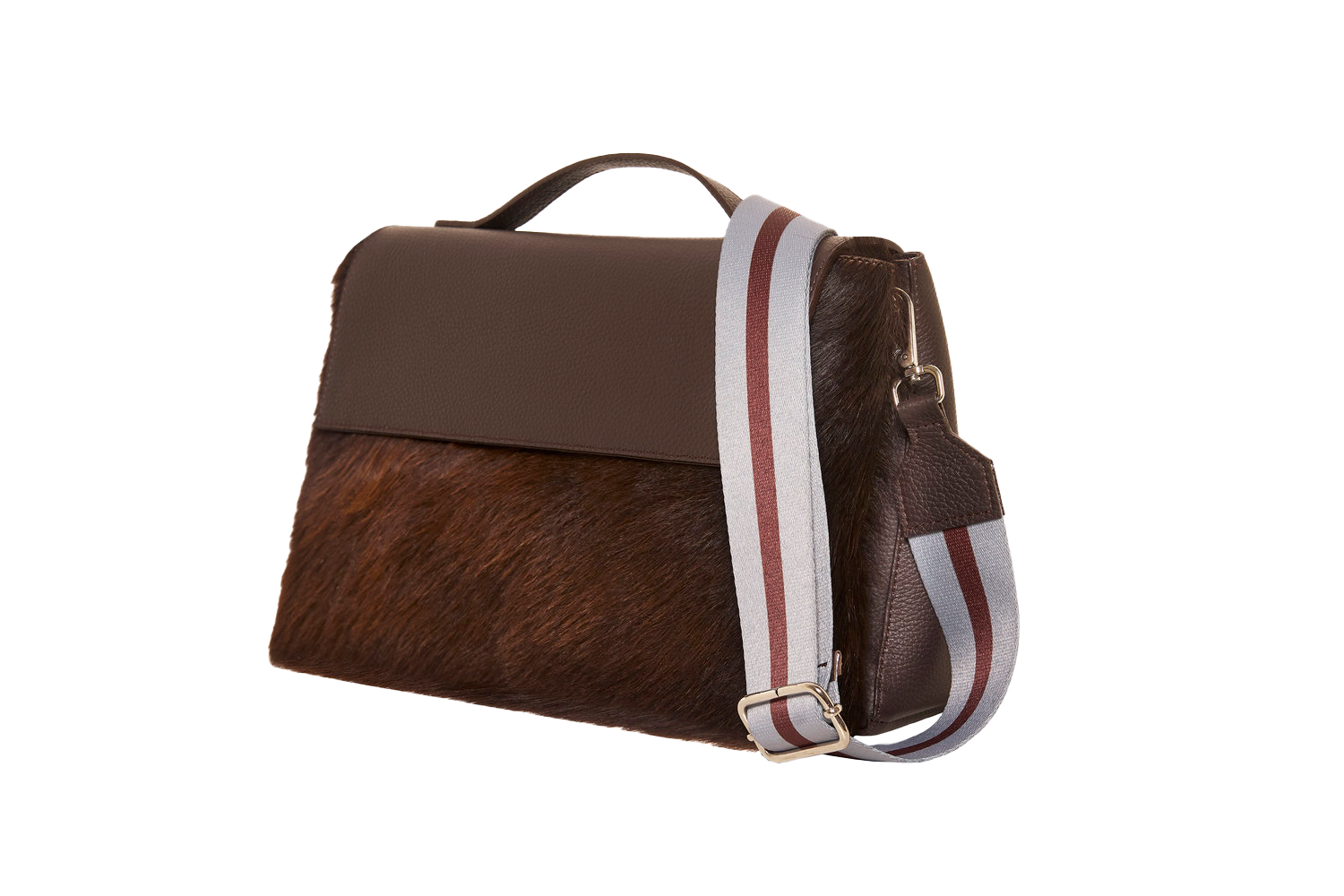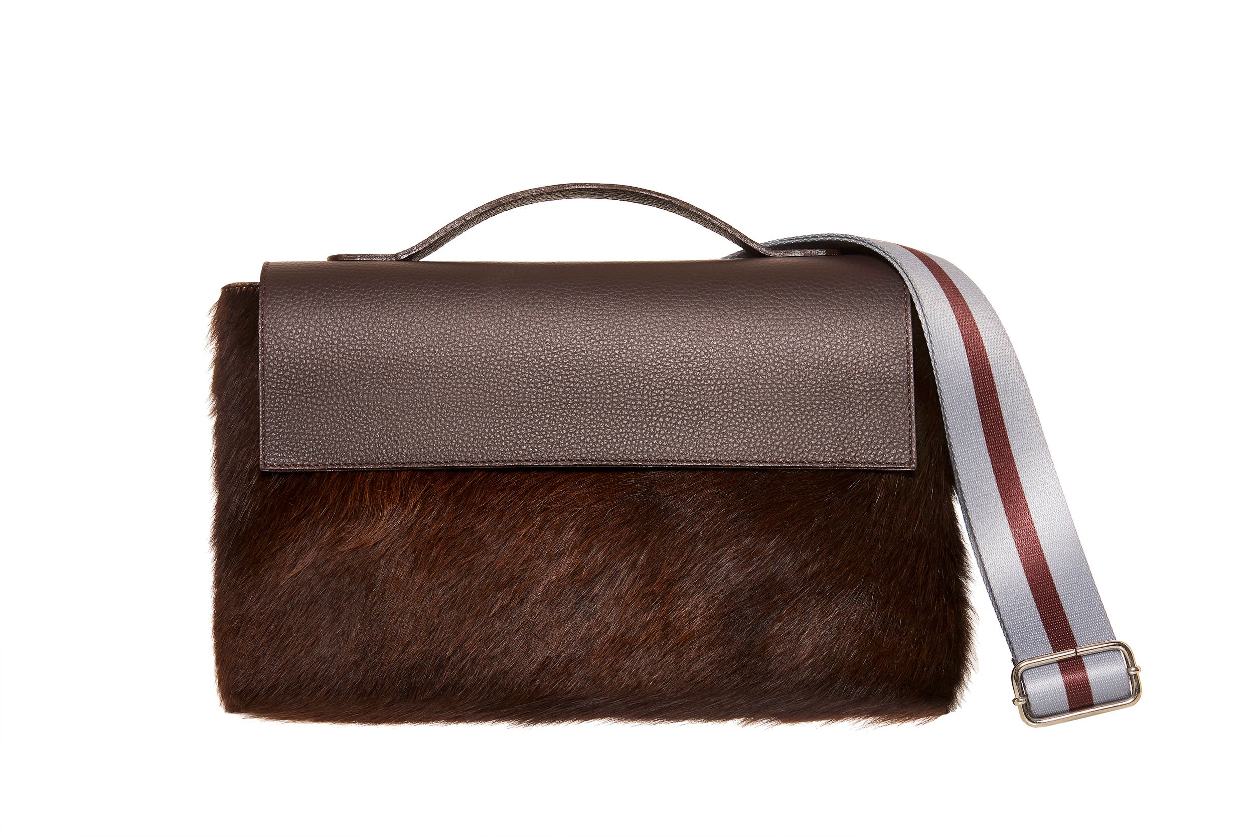 This is a monochromatic double bag; the front body is crafted from a deep brown calf hide and the back from chocolate Napa Argentine leather. The bag features a leather flap to the front with hidden magnetic snap closure.