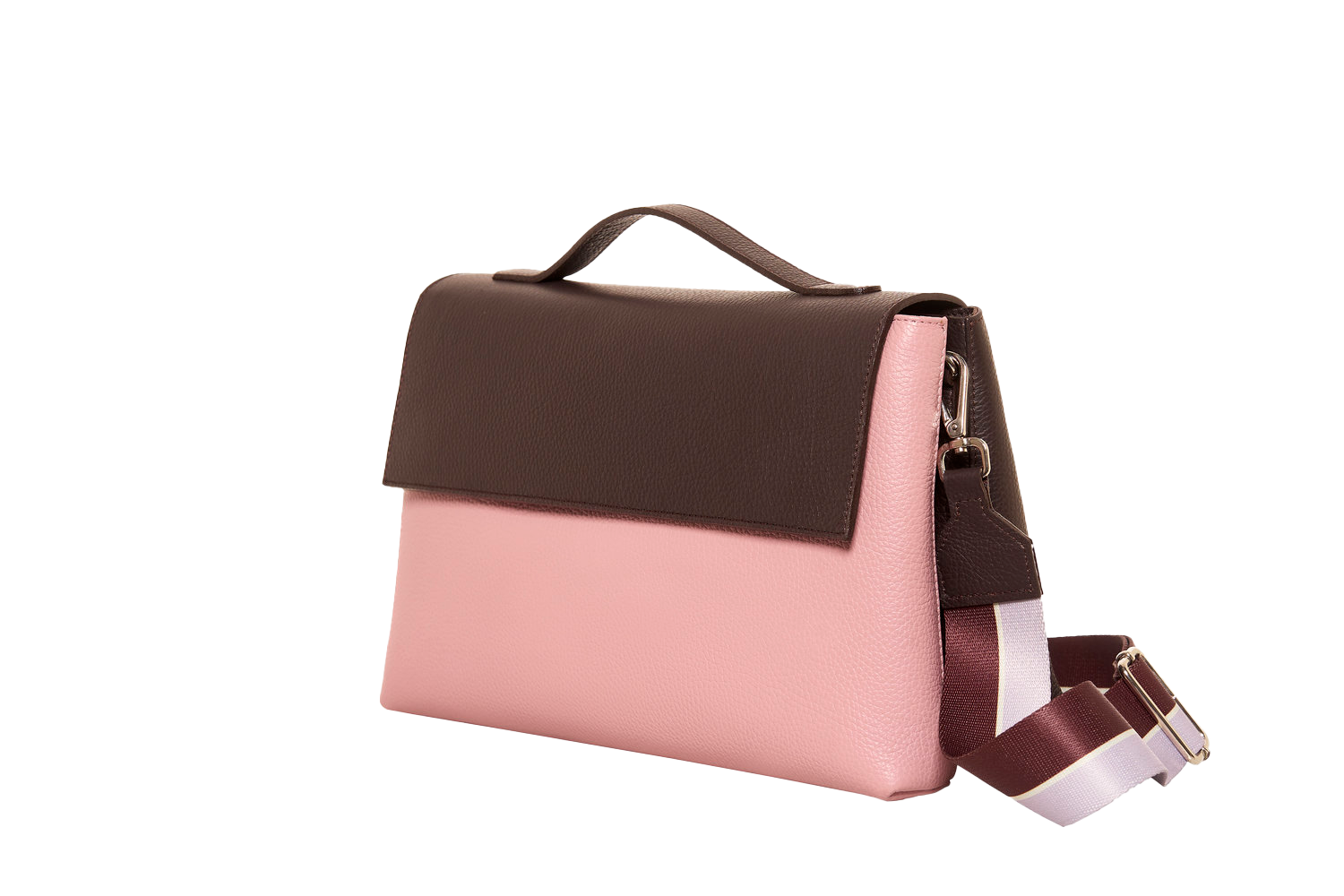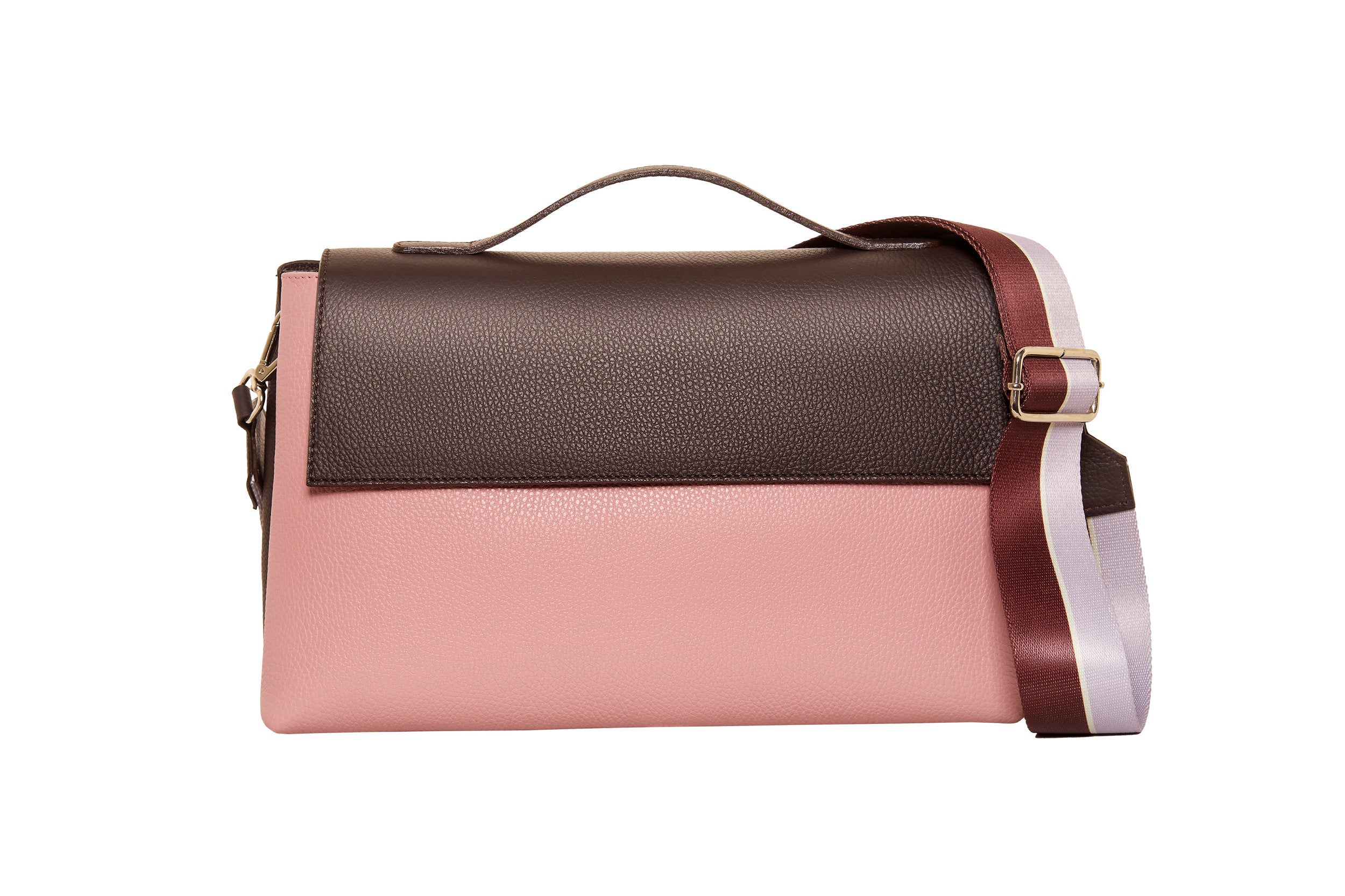 This is a bi-color double bag; the front body is crafted from a soothing pink leather and the back from deep chocolate Napa Argentine leather. The bag features a leather flap to the front with hidden magnetic snap closure.